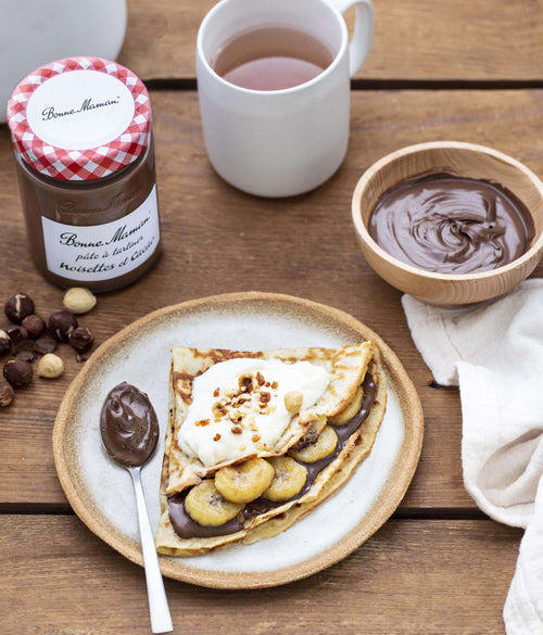 - Pour le dressage : Tartinez chaque crêpe de Pâte à tartiner Bonne Maman. Ajoutez quelques tranches de bananes rôties à l’intérieur. Dégustez la crêpe accompagnée de chantilly. Bon appétit !