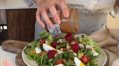 Cette recette fonctionne à merveille avec les confitures de fraises, de figues, d’abricots et forcément de framboises. Parfaite pour relever une salade de saison !